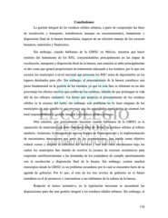 Conclusiones La gestión integral de los residuos sólidos urbanos, a parte de comprender las fases de recolección y transporte, transferencia (aunque no necesariamente), tratamiento y disposición final de la basura domiciliaria, requiere de un eficiente manejo de los recursos humanos, materiales y financieros. Sin embargo, cuando hablamos de la GIRSU en México, tenemos que hacer omisión del tratamiento de los RSU, concentrándolos principalmente en las etapas de recolección, transporte y disposición final de la basura; esta omisión se debe principalmente al alto costo que genera proporcionar un tratamiento adecuado a los residuos, por lo que son escasos los municipios a nivel nacional que procesan los RSU antes de depositarlos en los lugares destinados para ello. Sin embargo, el procesamiento de la basura constituye una pieza fundamental en la gestión de los residuos ya que en esta fase se eliminan en un alto porcentaje los efectos nocivos que conllevan los residuos, además de que prolongan la vida útil de los rellenos sanitarios. Un factor que propicia el procesamiento de los residuos sólidos es la escasez del suelo, sin embargo este problema no lo tiene ninguno de los municipios de este estudio lo que provoca que las autoridades municipales no asuman con total responsabilidad la gestión integral los residuos sólidos urbanos. Otra omisión, que generalmente hacemos cuando hablamos de la GIRSU es la separación de materiales que debe realizarse antes de llevar los residuos sólidos al relleno sanitario. Asimismo, la búsqueda de nuevas fuentes de financiamiento y la implementación de mecanismos innovadores por parte de los ayuntamientos, han tenido como objetivo reducir costos y ampliar la cobertura del servicio y han sido estos mecanismos bajo los cuales los municipios han tratado de resolver la escasez de recursos económicos para responder satisfactoriamente a las demandas de los ciudadanos de cumplir oportunamente con la recolección y disposición final de la basura. Sin embargo, existen muchos municipios donde la GIRSU es un problema secundario por lo cual se encuentra fuera de su agenda de gobierno. Por lo que, el reto de los tres niveles de gobierno en el futuro inmediato es el de promover y concientizar a sus habitantes de la cultura de la basura. Respecto al marco normativo, en la legislación mexicana se encuentran las disposiciones para dar una gestión integral a los residuos sólidos urbanos. Sin embargo, el 118