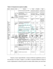 Tabla 12. Evaluación de la matriz de análisis Hipótesis Dimensiones Variables Indicadores Cajeme Hermosillo Nogales Existencia de programas para la GRSU. Insatisfactorio Satisfactorio Insatisfactorio Conocimiento de los programas por parte Insatisfactorio Satisfactorio Insatisfactorio Capacidad de los funcionarios. No son claros Claros No son claros de la Definición de objetivos y metas. Auto evalúan Auto evalúan Auto evalúan Unidad Logro de metas y objetivos. Operativa encargada % del presupuesto total asignado al 4.2% 6.1% 8.9% Legal - de prestar servicio de basura. Ambiental el servicio No. de camiones recolectores. 67 (Nuevos y 50 (Nuevos) 30 (La mitad viejos) regulares y la otra en malas La condiciones) asignació Cumplimiento de la normatividad vigente n de Capacidad en la ubicación y construcción de los No cumplen Cumplen No cumplen recursos del marco rellenos sanitarios. económic legal os y la Existencia de lotes baldíos usados como Sí Sí Sí carencia tiraderos de basura. de Ninguno Ninguno Ninguno programa Tipo de tratamiento que recibe la basura. s con Tiradero a Relleno RS Irregular objetivos, Condiciones de los sitios de disposición cielo abierto Sanitario metas e final (SDF). indicador Presencia de pepenadores en los SDF Sí Sí No es establecid Presupuesto asignado por cada ciudadano. 1356 pesos 1357 pesos 1357 pesos os; % del presupuesto total asignado al 4.2% 6.1% 8.9% impactan servicio de basura. la gestión Producción per cápita de basura. 1 kg. 650 grs. 1.33 kg. integral Costo de la Cantidad en toneladas de basura 144,000 169,056 90,000 de los política de recolectadas anualmente. residuos Económica recolección Cantidad en toneladas de basura 6 5.2 5 sólidos de basura recolectada por camión. urbanos Costos del tratamiento que reciben los No reciben No reciben No reciben residuos (si es que reciben). Costo de operación anual de los sitios de 1,732,494 16,567.488 6,457,260 disposición final. Costo por la gestión de cada tonelada de 149 364 253 basura. Número de rutas. 70 90 25 Cobertura 3 veces 2 veces 3 veces del servicio Frecuencia de recolección por semana. 100% 98% 100% Porcentaje de población beneficiada. 8.6 9.3 8.6 Calificación otorgada por la población. Social Satisfacció n de la Cantidad de quejas mensuales. No hay datos 2 No hay datos población Respecto al marco legal-ambiental, se observan diferencias significativas entre los tres municipios. En Cajeme y Nogales, en sus PMD se encuentran definidas las líneas de acción a implementarse en materia de gestión de residuos sólidos urbanos, pero estas líneas 121