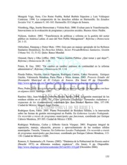 Munguía Vega, Nora, Ciro Romo Puebla, Rafael Borbón Siqueiros y Luis Velázquez Contreras. 1994. La composición de los desechos sólidos en Hermosillo. En Estudios Sociales Vol. V, número 9, 141-165. Hermosillo: El Colegio de Sonora. Nirenberg, Olga, Josette Brawerman y Violeta Ruiz. 2000. Evaluar para la Transformación. Innovaciones en la evaluación de programas y proyectos sociales. Buenos Aires: Paidós. Nickson, Andrew. 2002. “Transferencia de políticas y reforma en la gestión del sector público en América Latina: el caso del New Public Management”. Reforma y Democracia 24: 1-15. Oeltzchner, Hansjorg y Dieter Mutz. 1994. Guía para un manejo apropiado de los Rellenos Sanitarios Domésticos. En Desechos Sólidos. Sector Privado/Rellenos Sanitarios. Gestión Urbana Vol. 13, 51-52. Quito: Banco Mundial. Ormond, Darry y Elke Löffler. 2002. “Nueva Gestión Pública: ¿Qué tomar y qué dejar?”, Reforma y Democracia 24: 1-20. Peters, B. Guy. 2002. “De cambio en cambio: patrones de continuidad en la reforma administrativa”, Reforma y Democracia 24: 1-14. Pineda Pablos, Nicolás, García Figueroa, Rodríguez Camou, Cañez Navarrete, Enríquez Gaytán, Valenzuela Mendoza, Parra Plaza y Meza Arenas. 2005. Proyecto Estudio del Desempeño Municipal de El Colegio de Sonora. (En línea) 49 pp. Disponible: http://www.colson.edu.mx/Estudios%20Pol/Npineda/encuesta-desemp-municipal.pdf Pírez, Pedro. 2000. Servicios urbanos y equidad en América Latina. Un panorama con base en algunos casos. Santiago: ONU Ramírez Sáiz, Juan-Manuel y Alberto Chávez Sevilla. 1998. La gestión municipal de los residuos sólidos en el AMG. En ¿Cómo gobiernan Guadalaja? Demandas ciudadanas y respuestas de los Ayuntamientos, coordinado por Juan Manuel Ramírez Sáiz, 157-198. Ciudad de México: Miguel Ángel Porrúa. Rodríguez Korn, Fabio. 2003. Planta Procesadora de Residuos Sólidos, o la innovación sobre las formas de gestión microregional en Puebla. En Gobiernos Locales Trabajando. Un recorrido a través de programas municipales que funcionan, coordinado por Enrique Cabrero Mendoza, 287-305. Ciudad de México: CIDE. Rodríguez Wallenius, Carlos y Gilberto García Vázquez. 2003. Programa integral de separación, manejo, educación, proceso y aprovechamiento de los residuos sólidos municipales. Teocelo, Veracruz. En Gobiernos Locales Trabajando. Un recorrido a través de programas municipales que funcionan, coordinado por Enrique Cabrero Mendoza, 113- 130. Ciudad de México: CIDE. Romero, S. Santamaría y R. Ferrera. (2002). “Dinámica de la Poblacional de Eisenia andrei (Bouché 1972) en diferentes residuos orgánicos”. (En linea), 8 pp. Disponible: http://www.chapingo.mx/terra/contenido/20/3/art303-310.pdf (Diciembre 2004). 133