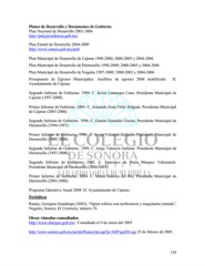 Planes de Desarrollo y Documentos de Gobierno Plan Nacional de Desarrollo 2001-2006 http://pnd.presidencia.gob.mx/ Plan Estatal de Desarrollo 2004-2009 http://www.sonora.gob.mx/ped/ Plan Municipal de Desarrollo de Cajeme 1998-2000; 2000-2003 y 2004-2006 Plan Municipal de Desarrollo de Hermosillo 1998-2000; 2000-2003 y 2004-2006 Plan Municipal de Desarrollo de Nogales 1997-2000; 2000-2003 y 2004-2006 Presupuesto de Egresos Municipales. Analítico de egresos 2004 modificado. H. Ayuntamiento de Cajeme. Segundo Informe de Gobierno. 1999. C. Javier Lamarque Cano. Presidente Municipal de Cajeme (1997-2000). Primer Informe de Gobierno. 2004. C. Armando Jesús Félix Holguín. Presidente Municipal de Cajeme (2003-2006). Segundo Informe de Gobierno. 1996. C. Gastón González Guerra. Presidente Municipal de Hermosillo (1994-1997). Primer Informe de Gobierno. 1998. C. Jorge Valencia Jiullerat. Presidente Municipal de Hermosillo (1997-2000). Segundo Informe de Gobierno. 1999. C. Jorge Valencia Jiullerat. Presidente Municipal de Hermosillo (1997-2000). Segundo Informe de Gobierno. 2002. C. Francisco de Paula Búrquez Valenzuela. Presidente Municipal de Hermosillo (2000-2003). Primer Informe de Gobierno. 2004. C. Maria Dolores del Río. Presidente Municipal de Hermosillo (2003-2006). Programa Operativo Anual 2004. H. Ayuntamiento de Cajeme. Periódicos Ruano, Georgina Guadalupe (2005), “Opera relleno con ineficiencia y maquinaria rentada”, Nogales, Sonora, El Centinela, número 76. Otros vínculos consultados http://www.obregon.gob.mx/ Consultado el 9 de enero del 2005 http://www.sonora.gob.mx/portal/Runscript.asp?p=ASP\pg269.asp 23 de febrero de 2005 136