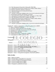 3.2.2. Plan Municipal de Desarrollo de Hermosillo 2004-2006 ....................................... 79 3.2.3. Organización del área para la gestión de los residuos sólidos urbanos .................. 81 3.2.4. Recursos materiales, humanos y financieros .......................................................... 82 3.2.5. Operación del servicio de recolección de basura .................................................... 83 3.2.6. Costo de la GRSU .................................................................................................. 86 3.2.7. Atención y percepción ciudadana sobre el servicio de recolección de basura ....... 87 3.3. Características generales del municipio de Nogales.................................................. 88 3.3.1. Antecedentes de la política para la GRSU en Nogales de 1994 al 2003 ................ 89 3.3.2. Plan Municipal de Desarrollo de Nogales 2004-2006 ............................................ 90 3.3.3. Organización del área para la gestión de los residuos sólidos urbanos .................. 92 3.3.4. Recursos materiales, humanos y financieros .......................................................... 93 3.3.5. Operación del servicio de recolección de basura .................................................... 94 3.3.6. Costo de la GRSU .................................................................................................. 98 3.3.7. Atención y percepción ciudadana sobre el servicio de recolección de basura ....... 99 Capítulo IV. Análisis comparativo y evaluación general de la GIRSU .................... 101 4.1. Planes y programas de gobierno .............................................................................. 102 4.2. Dirección y organización del servicio de limpia ..................................................... 103 4.3. Presupuesto destinado al servicio de recolección de basura .................................... 104 4.4. Infraestructura y generación de basura .................................................................... 106 4.5. Sitios de disposición final ........................................................................................ 108 4.6. Cobertura del servicio y satisfacción ciudadana ...................................................... 114 4.7. Continuidad de la GRSU a partir de 1994 ............................................................... 115 Conclusiones ..................................................................................................................... 118 Bibliografía ....................................................................................................................... 131 Anexos ........................................................................................................................... 137 Ilustración 1. Anexo 1. H. Ayuntamiento de Cajeme ......................................................... 138 Ilustración 2. Anexo 2. Dirección de Servicios Públicos de Cajeme ................................. 139 Ilustración 3. Anexo 3. H. Ayuntamiento de Hermosillo ................................................... 140 Ilustración 4. Anexo 4. DGR y ARS .................................................................................. 141 Ilustración 5. Anexo 5. H. Ayuntamiento de Nogales ........................................................ 142 Ilustración 6. Anexo 6. Dirección de Servicios Públicos de Nogales ................................ 143 Ilustración 7. Anexo 7. Guía general de preguntas a funcionarios públicos ...................... 144 Índice de tablas Tabla 1. Matriz de Análisis .................................................................................................. 42 Tabla 2. Normatividad y responsables de su ejecución ........................................................ 64 Tabla 3. Costo de la Política de Recolección de Basura ...................................................... 74 Tabla 4. Costo de la política para la GIRSU ........................................................................ 86 Tabla 5. Costo de la política para la GIRSU ........................................................................ 98 Tabla 6. Presupuesto y producción de basura .................................................................... 105 4