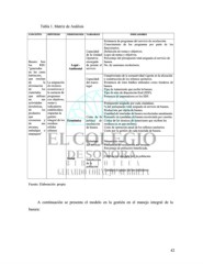 Tabla 1. Matriz de Análisis CONCEPTO HIPÓTESIS DIMENSIONES VARIABLES INDICADORES Existencia de programas del servicio de recolección. Conocimiento de los programas por parte de los funcionarios. Capacidad Definición de metas y objetivos. de la Unidad Logro de metas y objetivos. Operativa Porcentaje del presupuesto total asignado al servicio de Basura: Son encargada basura. los RSU Legal - de prestar el No. de camiones recolectores. “generados Ambiental servicio en las casas habitación, Cumplimiento de la normatividad vigente en la ubicación que resultan Capacidad y construcción de los rellenos sanitarios. de la La asignación del marco Existencia de lotes baldíos utilizados como tiraderos de eliminación de recursos legal basura. de los económicos y Tipo de tratamiento que recibe la basura. materiales la carencia de Tipo de sitio de disposición final (SDF). que utilizan programas Presencia de pepenadores en los SDF. en sus con objetivos, actividades metas e Presupuesto asignado por cada ciudadano. domésticas, indicadores % del presupuesto total asignado al servicio de basura. de los establecidos; Producción per cápita de basura. productos impactan la Cantidad de toneladas de basura recolectadas anualmente. que gestión Costo de la Promedio de toneladas de basura recolectada por camión. consumen y integral de los Económica política de Costos de las técnicas de tratamiento que reciben los de sus residuos recolección residuos (si es que reciben). envases, sólidos de basura Costo de operación anual de los rellenos sanitarios. embalajes o urbanos Costo por la gestión de cada tonelada de basura. empaques” Cobertura Número de rutas. del servicio Frecuencia de recolección por semana. Porcentaje de población beneficiada. Calificación otorgada por la población Social Satisfacción de la población Cantidad de quejas de los ciudadanos. Fuente: Elaboración propia A continuación se presenta el modelo en la gestión en el manejo integral de la basura: 42
