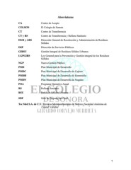 Abreviaturas CA Centro de Acopio COLSON El Colegio de Sonora CT Centro de Transferencia CT y RS Centro de Transferencia y Relleno Sanitario DGR y ARS Dirección General de Recolección y Administración de Residuos Sólidos DSP Dirección de Servicios Públicos GIRSU Gestión Integral de Residuos Sólidos Urbanos LGPGIRS Ley General para la Prevención y Gestión integral de los Residuos Sólidos NGP Nueva Gestión Pública PMD Plan Municipal de Desarrollo PMDC Plan Municipal de Desarrollo de Cajeme PMDH Plan Municipal de Desarrollo de Hermosillo PMDN Plan Municipal de Desarrollo de Nogales POA Programa Operativo Anual RS Relleno Sanitario RSU Residuos Sólidos Urbanos SDF Sitio de Disposición Final Tec Med S.A. de C.V. Técnicas Medioambientales de México, Sociedad Anónima de Capital Variable 7