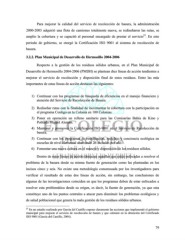 Para mejorar la calidad del servicio de recolección de basura, la administración 2000-2003 adquirió una flota de camiones totalmente nueva, se rediseñaron las rutas, se 23 amplio la cobertura y se capacitó al personal encargado de prestar el servicio . En este periodo de gobierno, se otorgó la Certificación ISO 9001 al sistema de recolección de basura. 3.2.2. Plan Municipal de Desarrollo de Hermosillo 2004-2006 Respecto a la gestión de los residuos sólidos urbanos, en el Plan Municipal de Desarrollo de Hermosillo 2004-2006 (PMDH) se plantean diez líneas de acción tendientes a mejorar el servicio de recolección y disposición final de estos residuos. Entre las más importantes de estas líneas de acción destacan las siguientes: 1) Continuar con los programas de búsqueda de eficiencias en el manejo financiero y atención del Servicio de Recolección de Basura. 2) Rediseñar rutas con la finalidad de incrementar la cobertura con la participación en el programa Contigo en tu Colonia en 100 Colonias. 3) Poner en operación un relleno sanitario para las Comisarías Bahía de Kino y Poblado Miguel Alemán. 4) Mantener y promover la Certificación ISO-9001 en el Servicio de Recolección de basura. 5) Continuar con los programas de reutilización, reciclaje y conciencia ecológica en escuelas de nivel elemental abarcando 26 escuelas por año. 6) Fomentar una nueva cultura en el manejo y disposición de los residuos sólidos. Dentro de estas líneas de acción destacan aquellas que están enfocadas a resolver el problema de la basura desde su misma fuente de generación como las planteadas en los incisos cinco y seis. No existe una metodología consensuada por los investigadores para verificar el resultado de estas dos líneas de acción, sin embargo, las conclusiones de algunas de las investigaciones coinciden en que los programas deben de estar enfocados a resolver esta problemática desde su origen, es decir, la fuente de generación, ya que esta constituye uno de los puntos centrales a atacar para disminuir los problemas ecológicos y de salud poblacional que genera la mala gestión de los residuos sólidos urbanos. 23 En un estudio realizado por García del Castillo expone claramente las acciones que implementó el gobierno municipal para mejorar el servicio de recolección de basura y que culminó en la obtención del Certificado ISO 9001 (García del Castillo, 2004). 79
