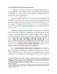 3.2.5. Operación del servicio de recolección de basura 29 Los habitantes de la ciudad de Hermosillo generan aproximadamente 650 gramos de basura diariamente lo que anualmente constituye una cantidad de 169 056 toneladas que son depositadas en el relleno sanitario. Para la recolección y disposición final de los residuos se lleva a cabo el siguiente proceso: La ciudad se encuentra dividida en tres sectores norte, centro y sur, además con 90 rutas diarias se cubre toda la ciudad. A cada uno de los sectores le corresponde dos días de recolección de residuos sólidos por semana. El servicio de recolección inicia entre 5 y 5:30 a.m. y regresan a la Dirección de Servicios Públicos entre 10 y 11 a.m. Aproximadamente, a esta hora empieza a laborar el personal del segundo turno y lo más tarde que regresan es 30 entre 12 y 1 a.m. Diariamente se realizan 91 viajes en promedio con un poco más de 5 toneladas de residuos sólidos; salen 45 vehículos en un primer turno, a un sector determinado. Recogen la basura y la llevan directamente al relleno sanitario, descargan y regresan a patios de recolección. Posteriormente, los camiones recolectores son ocupados por los empleados del segundo turno, que igual salen 45 unidades para concluir con la zona en específico. El camión recolector va ocupado por tres tripulantes, el chofer y dos auxiliares, estos dos últimos que son los encargados de recoger la basura de las viviendas realizan una primer prepepena de materiales que pueden ser reciclados, principalmente metales lo que les 31 significa un ingreso extra al salario otorgado por el ayuntamiento . En la política de limpia de residuos sólidos en Hermosillo no se contemplan las fases de transferencia, procesamiento ni recuperación de materiales por lo que estos residuos son llevados de manera directa hasta el sitio de disposición final. La etapa de transferencia no es de ninguna manera imprescindible para llevar un adecuado control de 29 Para sacar este promedio se considero el tamaño de la población estimado por la COESPO para el municipio de Hermosillo en el 2004, (se le restó la población de la costa), así como la cantidad de basura que fue depositada en el relleno sanitario, la cual fue proporcionada por el Director General de Recolección y Administración de Residuos Sólidos (169 056 toneladas anuales). 30 La información referente a los horarios de trabajo fue obtenida a través de una entrevista a funcionario público de Hermosillo 1. 31 Entre los materiales que son recuperados por los empleados de limpia se encuentran también las baterías de vehículos automotores y llantas, según comento un empleado del relleno sanitario este tipo de artículos generalmente no llegan al RS. 83