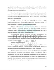 capacidad (40 m3) mediante una prensa hidráulica. Después de vaciar los RSU, se vuelve a registrar el peso de los camiones para obtener las cantidades reales de estos residuos depositados en la estación de transferencia. Una vez llenos las cajas son transportadas por tractocamiones al relleno sanitario. Se estima que en promedio cada tractocamión se lleva al relleno sanitario 25 toneladas y entre los seis tractocamiones disponibles realizan entre 10 y 12 viajes diarios pudiendo llegar hasta 15 en el periodo de verano. Con el fin de reducir el número de viajes del CT al RS sólo se reciben los RSU recolectados por Dirección de Servicios Públicos Municipales, particulares y escuelas. Los demás los tienen que ir a depositar directamente al relleno sanitario. El Centro de Transferencia se encuentra ubicado en el área que anteriormente ocupaba el tiradero a cielo abierto. El equipo con el que funciona tanto el Centro de Transferencia como el Relleno Sanitario se encuentra en malas condiciones por lo que se estima que opera en un 50 por ciento de su capacidad normal. La intervención de grupos de pepenadores en el CT es muy limitada ya que actualmente sólo se les permite realizar la recuperación de materiales a un pequeño grupo de ellos compuesto por ocho pepenadores a cambio, este grupo de pepenadores realizan actividades de limpieza en el CT. Operación del Relleno Sanitario El relleno sanitario se encuentra ubicado a 22 kilómetros al suroeste de la ciudad de Nogales en el predio “El Bellotoso” y tiene un promedio de vida estimado entre 25 y 30 años para lo cual se tiene contemplado para el área total de celdas 26 hectáreas. El relleno sanitario inició operaciones en enero de 1995 el objetivo principal del relleno sanitario era por una parte, cerrar el antiguo basurero a cielo abierto en donde se depositaban los RSU y por otra, dar un adecuado confinamiento a los RSU evitando con ello la contaminación del medio ambiente y; a su vez, preservar una imagen limpia de la ciudad. El relleno sanitario es operado directamente por personal del ayuntamiento de Nogales los 365 días del año, y el proceso es el siguiente: 96