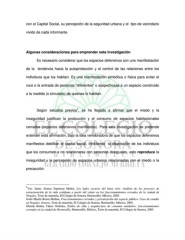 con el Capital Social, su percepción de la seguridad urbana y el tipo de vecindario vivido de cada informante. Algunas consideraciones para emprender esta investigación Es necesario considerar que los espacios defensivos son una manifestación de la tendencia hacia la autoprotección y el control de las relaciones entre los individuos que los habitan. Es una manifestación simbólica o física para evitar el roce o la entrada de personas “diferentes” o sospechosas a un espacio construido a la medida (o simulado) de quienes lo habitan. 5 Según estudios previos , se ha llegado a afirmar que el miedo y la inseguridad justifican la producción y el consumo de espacios habitacionales cerrados (espacios defensivos manifiestos). Para esta investigación se pretende extender está afirmación, bajo la idea vertebradora de que los espacios defensivos manifiestos debilitan el capital social, inhibiendo la disposición de los individuos que los consumen a no relacionarse con personas desiguales, esto reproduce la inseguridad y la percepción de espacios urbanos relacionados con el miedo o la precaución. 5 Ver: Jaime Alonso Espinoza Muñiz, Los lados oscuros del buen vivir. Análisis de los procesos de estructuración de la vida cotidiana a partir del relato en los fraccionamientos cerrados de la ciudad de Nogales, Tesis de maestría, El Colegio de Sonora, Hermosillo, México, 2005. Jesús Martín Rosas Molina, Fraccionamientos cerrados y privatización del espacio público. Caso de estudio en Nogales, Sonora, Tesis de maestría, El Colegio de Sonora, Hermosillo, México, 2005. Glenda Betina Yánez Ordiales, Estilos de vida y arquitectura de consumo emulativo: fraccionamientos cerrados en la ciudad de Hermosillo, Hermosillo, México, Tesis de maestría, El Colegio de Sonora, 2005.