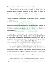 Metodología para la aplicación del instrumento de medición Para la aplicación del instrumento de medición del Capital social y la seguridad urbana en espacios defensivos de clase media se realizó un Levantamiento: del 05 al 07 de abril de 2007 en la ciudad de Nogales. Tamaño de la muestra: 39 entrevistas en el EDM Real del Arco, y 37 entrevistas en el EDL, Villa Bonita. Metodología: Entrevistas personales, en forma de cuestionario a los residentes de los fraccionamientos en sus hogares de las 10 a 13 hrs. Y de 16 a 20 hrs. aproximadamente. Marco del muestreo: se aplicó un muestreo aleatorio sistemático a los residentes en mención bajo la condición de que tuvieran un mínimo de cinco años de residencia en el fraccionamiento o colonia, y con hijos que asisten a la escuela. En el caso de que esto no se cumpliera se optó por el reemplazo de la familia. Lo anterior responde al supuesto de que el tiempo de residencia es suficiente para entablar relaciones en el vecindario, aumento o deterioro de las relaciones sociales (redes, confianza, reciprocidad y participación), y, el tener hijos que asisten a la escuela genera mayor demanda de seguridad familiar. Cada cuestionario se aplicó a un miembro del hogar esposo/a o cónyuge, según quien estuviera disponible para responder al momento de la entrevista. La