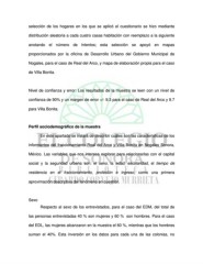 selección de los hogares en los que se aplicó el cuestionario se hizo mediante distribución aleatoria a cada cuatro casas habitación con reemplazo a la siguiente anotando el número de intentos; esta selección se apoyó en mapas proporcionados por la oficina de Desarrollo Urbano del Gobierno Municipal de Nogales, para el caso de Real del Arco, y mapa de elaboración propia para el caso de Villa Bonita. Nivel de confianza y error: Los resultados de la muestra se leen con un nivel de confianza de 90% y un margen de error +/- 9.3 para el caso de Real del Arco y 9.7 para Villa Bonita. Perfil sociodemográfico de la muestra En este apartado se tratará de describir cuáles son las características de los informantes del fraccionamiento Real del Arco y Villa Bonita en Nogales Sonora, México. Las variables que nos interesa explorar para relacionarlas con el capital social y la seguridad urbana son: el sexo, la edad, escolaridad, el tiempo de residencia en el fraccionamiento, profesión e ingreso, como una primera aproximación descriptiva del fenómeno en cuestión. Sexo Respecto al sexo de los entrevistados, para el caso del EDM, del total de las personas entrevistadas 40 % son mujeres y 60 % son hombres. Para el caso del EDL, las mujeres alcanzaron en la muestra el 60 %, mientras que los hombres suman el 40%. Esta inversión en los datos para cada una de las colonias, no