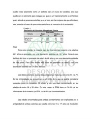 puede verse solamente como un atributo para el cruce de variables, sino que puede ser un elemento para indagar por que en un fraccionamiento es el hombre quien atiende a personas extrañas, y en el otro, son las mujeres las que afrontaron esta tarea (en el caso de que ambos estuvieran al momento de la entrevista). Cuadro 1 Distribución del Informante Adecuado por Colonia Informante Mujer Hombre Colonia Abs % Abs % Real del Arco 14 40.0 24 60.0 Villa Bonita 21 60.0 16 40.0 Total 35 100.0 40 100.0 Edad Para esta variable, la muestra para las dos colonias presenta una edad de 44.7 años en promedio, con una desviación estándar de 10.7 años. Para el caso de Real del Arco un promedio de edad de 46 años y con una desviación estándar de 13.8 años. Para Villa Bonita 43.5 años en promedio de edad y con una desviación estándar de 5.7 años de edad. Los datos anteriores revelan dos poblaciones maduras, sólo el 2.6% y 2.7% de los entrevistados se encuentran en el límite de lo que se podría considerar población joven en transición (30 años), y con una clara concentración en las edades de entre 36 y 50 años. En este rango, el EDM tiene un 74.3% de los informantes de la muestra y el EDL un 80.6% de los entrevistados. Las edades encontradas para ambos asentamientos son explicables por la antigüedad de ambas colonias que oscila entre los 15 y 17 años de fundación,