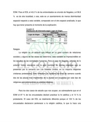 EDM. Para el EDL el 43.2 % de los entrevistados es oriundo de Nogales y el 56.8 % es de otra localidad, o sea, este es un asentamiento de menos disimilaridad espacial respecto a esta variable, comparado con el otro espacio analizado, lo que hay que tener presente al momento de la explicación. Cuadro 6 Distribución del Informante según Lugar de Origen Informante Lugar de Origen Real del Arco Villa Bonita Abs % Abs % Nogales 15 38.5 16 43.2 Otra localidad 24 61.5 21 56.8 Total 39 100.0 37 100.0 Religión La religión es un atributo que influye en un gran número de relaciones sociales y alguna de las veces las determina, esta variable es imprescindible en los estudios de las sociedades humanas. Para el caso de Nogales, además de lo anterior, cobra relevancia por la gran cantidad de ofertas religiosas que se presentan por la cercanía con Los Estados Unidos, en su mayoría religiones cristianas protestantes. Este fenómeno es evidente los fines de semana cuando dos de las plazas más importantes de la ciudad son ocupadas por este tipo de religiones para promocionar su práctica religiosa. Para los dos casos de estudio que nos ocupan, es sobresaliente que en el EDM el 87 % de los encuestados declaró practicar la fe católica y el 13 % la protestante. El caso del EDL es totalmente diferente porque el 100 % de los encuestados declararon pertenecer a la religión católica, lo que la hace una