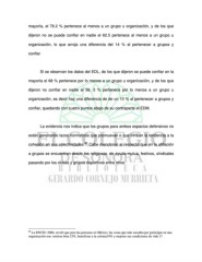mayoría, el 76.2 % pertenece al menos a un grupo u organización, y de los que dijeron no se puede confiar en nadie el 62.5 pertenece al menos a un grupo u organización, lo que arroja una diferencia del 14 % al pertenecer a grupos y confiar Si se observan los datos del EDL, de los que dijeron se puede confiar en la mayoría el 68 % pertenece por lo menos a un grupo u organización, y de los que dijeron no confiar en nadie el 58. 3 % pertenece por lo menos a un grupo u organización, es decir hay una diferencia de de un 10 % al pertenecer a grupos y confiar, quedando con cuatro puntos abajo de su contraparte el EDM. La evidencia nos indica que los grupos para ambos espacios defensivos no están generando lazos normativos que promuevan o que inhiban la tendencia a la 90 cohesión en sus colectividades. Cabe mencionar al respecto que en la afiliación a grupos se encuentran desde los religiosos, de ayuda mutua, festivos, sindicales pasando por los clubes y grupos deportivos entre otros. 90 La ENCSU 2006, reveló que para las personas en México, las cosas que más suceden por participar en una organización son: sentirse bien 23%, beneficiar a la colonia19% y mejorar sus condiciones de vida 17.
