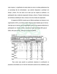 resto mujeres. Lo significativo de estos datos es como en ambas poblaciones hay un porcentaje alto de entrevistados que estarían dispuestos a participar con tiempo y dinero. Por otro lado es de notar que las mujeres se adhieren a la participación alta y media de cooperación (tiempo y dinero y Tiempo) mientras que los hombres se distribuyen más o menos en los tres niveles de cooperación. Al respecto la ENCSU muestra que en México participan con tiempo en una organización el 43% y con dinero el 42%. Para los casos tratados aquí el nivel es más bajo que el nacional, pero es significativo como en los espacios defensivos la participación con tiempo y dinero concentra el mayor porcentaje (56% para el EDM y 48% para el EDL), dato que no incluye la ENCSU. Cuadro 12 Si un proyecto de la comunidad no lo beneficia directamente, pero tiene beneficios para muchas otras personas del barrio o fraccionamiento, contribuiría con...? Integrantes Contribución y Sexo Real del Arco Villa Bonita Abs % Abs % Tiempo 13 33.3 13 35.1 Hombre 7 53.8 4 30.8 Mujer 6 46.2 9 69.2 Dinero 2 5.1 5 13.5 Hombre 2 100.0 2 40.0 Mujer 0 0.0 3 16.7 Ambos 22 56.4 18 48.6 Hombre 15 68.2 10 55.6 Mujer 7 44.4 8 31.8 Nada 1 2.6 12.7 Mujer 1 100.0 1 100.0 Ns/Nc 12.6 00.0 Hombre 1 100.0 0 0.0 Total 39 100.0 37 100.0 Para cerrar esta sección es pertinente relacionar la contribución en proyectos comunitarios con el nivel de instrucción escolar de los residentes, pues