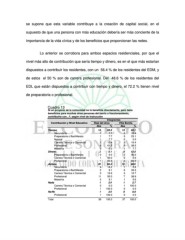 se supone que esta variable contribuye a la creación de capital social, en el supuesto de que una persona con más educación debería ser más conciente de la importancia de la vida cívica y de los beneficios que proporcionan las redes. Lo anterior se corrobora para ambos espacios residenciales, por que el nivel más alto de contribución que sería tiempo y dinero, es en el que más estarían dispuestos a contribuir los residentes, con un 56.4 % de los residentes del EDM, y de estos el 50 % son de carrera profesional. Del 48.6 % de los residentes del EDL que están dispuestos a contribuir con tiempo y dinero, el 72.2 % tienen nivel de preparatoria o profesional. Cuadro 13 Si un proyecto de la comunidad no lo beneficia directamente, pero tiene beneficios para muchas otras personas del barrio o fraccionamiento, contribuiría con...?, según nivel de instrucción Integrantes Contribución y Nivel Educativo Real del Arco % Villa Bonita % Abs Abs Tiempo 13 33.3 13 35.1 Secundaria 1 7.7 2 15.4 Preparatoria o Bachillerato 1 7.7 3 23.1 Normal 17.7 2 00.0 Carrera Técnica o Comercial 15.4 15.4 2 Profesional 8 61.5 5 38.5 Maestría 0 0.0 1 7.7 Dinero 2 0 5.1 5 2 13.5 0.0 40.0 Preparatoria o Bachillerato Carrera Técnica o Comercial 1 50.0 0 0.0 Profesional 1 50.0 3 60.0 Ambos 22 4 56.4 18 1 48.6 5.6 Secundaria 18.2 Preparatoria o Bachillerato 2 9.1 6 33.3 Carrera Técnica o Comercial 3 13.6 3 16.7 Profesional 11 50.0 7 38.9 2 5.6 Maestría 9.1 1 Nada 1 2.6 12.7 0.0 Carrera Técnica o Comercial 0 100.0 1 100.0 0.0 0 Profesional 1 Ns/Nc 12.6 00.0 Profesional 1 100.0 0 0.0 Total 39 100.0 37 100.0