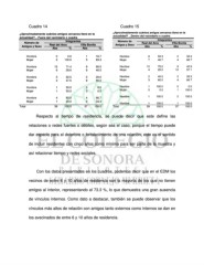 Cuadro 14 Cuadro 15 ¿Aproximadamente cuántos amigos cercanos tiene en la ¿Aproximadamente cuántos amigos cercanos tiene en la actualidad?....Fuera del vecindario o cuadra actualidad? ...Dentro del vecindario o cuadra Integrantes Número de Integrantes Número de Real del Arco Villa Bonita Amigos y Sexo Real del Arco % Villa Bonita % Amigos y Sexo Abs % Abs % Abs Abs Ninguno 3 7.7 6 16.2 Ninguno 15 38.5 6 16.2 Hombre 0 0.0 1 16.7 Hombre 8 53.3 2 33.3 Mujer 3 100.0 5 83.3 Mujer 7 46.7 4 66.7 De 1 a 5 21 53.8 15 40.5 De 1 a 5 16 41.0 21 56.8 Hombre 15 71.4 9 60.0 Hombre 12 75.0 9 42.9 Mujer 6 28.6 6 40.0 Mujer 4 25.0 12 57.1 De 6 a 10 8 20.5 10 27.0 De 6 a 10 5 12.8 6 16.2 Hombre 5 62.5 2 20.0 Hombre 2 40.0 2 33.3 Mujer 3 37.5 8 80.0 Mujer 3 60.0 4 66.7 De 11 a 15 2 5.1 0 0.0 De 11 a 15 1 2.6 12.7 Hombre 1 50.0 0 0.0 Hombre 1 100.0 0 0.0 Mujer 1 50.0 0 0.0 Mujer 0 0.0 1 100.0 Más de 16 512.8 6 16.2 Más de 16 12.6 2 5.4 2100.0 1100.0 Hombre 4 80.0 4 66.7 Ns/Nc Hombre 12.6 12.7 Mujer 1 20.0 2 33.3 Hombre 1100.0 1100.0 Total 39 100.0 37 100.0 Total 39 100.0 37 100.0 Respecto al tiempo de residencia, se puede decir que este define las relaciones o redes fuertes o débiles, según sea el caso, porque el tiempo puede dar espacio para el deterioro o fortalecimiento de una relación, este es el sentido de incluir residentes con cinco años como mínimo para ser parte de la muestra y así relacionar tiempo y redes sociales. Con los datos presentados en los cuadros, podemos decir que en el EDM los vecinos de entre 6 y 10 años de residencia son la mayoría de los que no tienen amigos al interior, representando el 73.3 %, lo que demuestra una gran ausencia de vínculos internos. Como dato a destacar, también se puede observar que los vínculos más altos de relación con amigos tanto externos como internos se dan en los avecinados de entre 6 y 10 años de residencia.