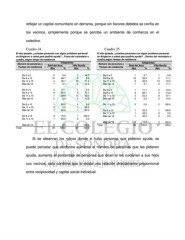 reflejar un capital comunitario en derrama, porque sin favores debidos se confía en los vecinos, simplemente porque se percibe un ambiente de confianza en el colectivo. Cuadro 24 Cuadro 25 El año pasado, ¿cuántas personas con algún problema personal El año pasado, ¿cuántas personas con algún problema personal se dirigieron a usted para pedirle ayuda? ...Fuera del vecindario o se dirigieron a usted para pedirle ayuda? ...Dentro del vecindario o cuadra, según iempo de residencia cuadra,según tiempo de residencia Integrantes Integrantes Número de personas y Real del Arco Villa Bonita Número de personas y Real del Arco Villa Bonita Tiempo de residencia Tiempo de residencia Abs%Abs% Abs % Abs % Ninguno 15 38.5 14 37.8 Ninguno 27 69.2 18 48.6 De 0 a 5 0 0.0 2 14.3 De 0 a 5 1 3.7 1 5.6 De 6 a 10 10 66.7 0 0.0 De 6 a 10 16 59.3 2 11.1 De 11 a 15 4 26.7 10 71.4 De 11 a 15 9 33.3 13 72.2 Más de 16 1 6.7 2 14.3 Más de 16 1 3.7 2 11.1 De 1 a 5 18 46.2 19 51.4 De 1 a 5 9 23.1 14 37.8 De 0 a 5 2 11.1 1 5.3 De 0 a 5 1 11.1 2 14.3 De 6 a 10 9 50.0 4 21.1 De 6 a 10 6 66.7 2 14.3 De 11 a 15 7 38.9 12 63.2 De 11 a 15 2 22.2 8 57.1 Más de 16 0 0.0 2 10.5 Más de 16 0 0.0 2 14.3 De 6 a 10 2 5.1 2 5.4 De 6 a 10 0 0.0 2 5.4 De 6 a 10 1 50.0 0 0.0 De 11 a 15 0 0.0 2 100.0 De 11 a 15 0 0.0 1 50.0 Más de 16 37.7 12.7 Más de 16 1 50.0 1 50.0 De 6 a 10 1 33.3 1 100.0 Más de 16 410.3 1 2.7 De 11 a 15 1 33.3 0 0.0 De 6 a 10 3 75.0 1 100.0 Más de 16 1 33.3 0 0.0 De 11 a 15 1 25.0 0 0.0 Ns/Nc 0 0.0 2 5.4 Ns/Nc 0 0.0 1 2.7 Más de 16 0 0.0 2 100.0 Más de 16 0 0.0 1 100.0 Total 39 100.0 37 100.0 Total 39 100.0 37 100.0 Si se observan los rubros donde si hubo personas que pidieron ayuda, se puede percatar que conforme aumenta el número de personas que les pidieron ayuda, aumenta el porcentaje de personas que dicen si les cuidarían a sus hijos sus vecinos, esto confirma que si existe una relación directamente proporcional entre reciprocidad y capital social individual.
