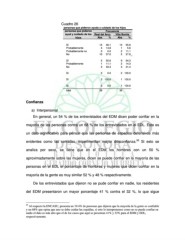 Cuadro 26 personas que pidieron ayuda y cuidado de los hijos personas que pidieron Frecuencia ayud y cuidado de los Real del Arco Villa Bonita hijos Abs % Abs % Ninguno 27 69.2 18 48.6 Sí 13 48.1 10 55.6 5.6 Probablemente 4 14.8 1 2 11.1 Probablemente no 0.0 0 No 10 37.0 5 27.8 De 1 a 5 9 23.0 14 37.8 Sí 5 55.6 9 64.3 Probablemente 1 11.1 2 3 14.3 No 21.4 33.3 3 De 6 a 10 0 0.0 2 100.0 Sí 0 0.0 2 100.0 Más de 16 3100.0 1 100.0 3 100.0 Sí 1 100.0 Ns/Nc 0 0.0 1 100.0 Sí 0 0.0 1 100.0 total 39 36 Confianza a) Interpersonal En general, un 54 % de los entrevistados del EDM dicen poder confiar en la mayoría de las personas contra un 68 % de los entrevistados en el EDL. Este es un dato significativo para pensar que las personas de espacios defensivos más 93 evidentes como las cerradas, experimentan mayor desconfianza. Si esto se analiza por sexo, se tiene que en el EDM los hombres con un 50 % aproximadamente sobre las mujeres, dicen se puede confiar en la mayoría de las personas en el EDL el porcentaje de hombres y mujeres que dicen confiar en la mayoría de la gente es muy similar 52 % y 48 % respectivamente. De los entrevistados que dijeron no se pude confiar en nadie, los residentes del EDM presentaron un mayor porcentaje 41 % contra el 32 %, lo que sigue 93 Al respecto la ENCASU, presenta un 19.4% de personas que dijeron que la mayoría de la gente es confiable y un 68% que opina que uno se debe cuidar las espaldas, si esto lo interpretamos como no se puede confiar en nadie el dato es más alto que el de los casos que aquí se presentan 41% y 32% para el EDM y EDL, respectivamente.
