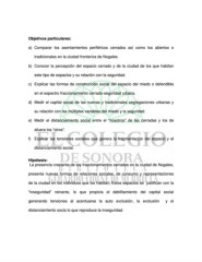 Objetivos particulares: a) Comparar los asentamientos periféricos cerrados así como los abiertos o tradicionales en la ciudad fronteriza de Nogales. b) Conocer la percepción del espacio cerrado y de la ciudad de los que habitan este tipo de espacios y su relación con la seguridad. c) Explicar las formas de construcción social del espacio del miedo o defendible en el espectro fraccionamiento cerrado-seguridad urbana. d) Medir el capital social de las nuevas y tradicionales segregaciones urbanas y su relación con las múltiples variables del miedo y la seguridad. e) Medir el distanciamiento social entre el “nosotros” de las cerradas y los de afuera los “otros”. f) Explicar las tensiones sociales que genera la fragmentación del espacio y el distanciamiento social. Hipótesis: La presencia creciente de los fraccionamientos cerrados en la ciudad de Nogales, presenta nuevas formas de relaciones sociales, de consumo y representaciones de la ciudad en los individuos que los habitan, Estos espacios se justifican con la “inseguridad” reinante, lo que propicia el debilitamiento del capital social generando tensiones al acentuarse la auto exclusión, la exclusión y el distanciamiento socia lo que reproduce la inseguridad.