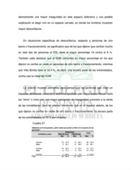 demostrando una mayor inseguridad en este espacio defensivo y una posible explicación al elegir vivir en un espacio cerrado, en donde los hombres muestran mayor desconfianza. En situaciones especificas de desconfianza, respecto a personas de otro barrio o fraccionamiento, es significativo que de los que dijeron que confían mucho en este tipo de personas el EDL tiene el mayor porcentaje 19 contra el 8 %. También cabe destacar que el EDM concentra su mayor porcentaje en los que dijeron no confiar en nada en personas de otro barrio o fraccionamiento, mientras que Villa Bonita tiene el 32.4 %, es decir, una tercera parte de los entrevistados, contra casi la mitad del EDM. Lo anterior muestra elementos para pensar que las personas que viven en espacios defensivos claramente definidos perciben una mayor desconfianza hacia los “otros” o viven con una mayor percepción de inseguridad, contrario a la oferta de las inmobiliarias, pero es preciso mencionar que en el espacio abierto, de los que dijeron no confiar en nadie de otro barrio o fraccionamiento (la tercera parte de los entrevistados) el 75 % son mujeres. Cuadro 27 Hablando en forma general, ¿diría usted que puede confiar en la mayoría de las personas? Integrantes Total Confianza y sexo Real del Arco Villa Bonita % Abs % Abs Abs % Se puede confiar en la mayoría 21 53.8 25 67.6 46 121.4 13 52.0 61.9 13 26 113.9 Hombre Mujer 8 38.1 12 48.0 20 86.1 No se puede confiar en nadie 16 41.0 12 32.4 28 73.5 Hombre 10 62.5 3 25.0 13 87.5 15 112.5 9 75.0 Mujer 6 37.5 Ns/Nc 2 5.1 0 0.0 2 5.1 Hombre 2 100.0 0 0.0 2 100.0 Total 39 100.0 37 100.0