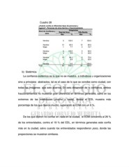 Cuadro 28 ¿Cuánto confía en diferentes tipos de personas y lugares?...Personas de otros barrios o fraccionamiento Nivel de Confianza y Real del Arco Integrantes Villa Bonita sexo Abs % Abs % 7.7 18.9 Mucho 3 3 100.0 7 7 100.0 Hombre Poco 13 33.3 12 32.4 Hombre 12 92.3 10 83.3 1 Mujer 7.7 16.7 2 Ni mucho ni poco 6 15.4 5 13.5 Hombre 6 100.0 3 60.0 0.0 40.0 Nada Mujer 17 0 43.6 12 2 32.4 Hombre 16 94.1 9 75.0 5.9 Ns/Nc Mujer 0 1 0.0 1 3 25.0 2.7 Hombre 0 0.0 1 100.0 Total 39 100.0 37 100.0 b) Sistémica La confianza sistémica es la que no se muestra a individuos u organizaciones sino a principios abstractos, tal es el caso de lo que se concibe como ciudad, con todas las imágenes que esto acarrea. En esta dimensión de la confianza, ambos fraccionamientos no muestran gran diferencia en términos generales, salvo en los extremos de las mediciones (mucho y nada), donde el EDL muestra más porcentaje de los que dijeron mucho, superando al EDM con un 8 %. De los que dijeron no confiar en nada en la ciudad, el EDM concentra al 26 % de los entrevistados, contra el 19 % del EDL, en términos generales este confía más en la ciudad, salvo cuando los entrevistados respondieron poco, donde las proporciones se muestran similares.