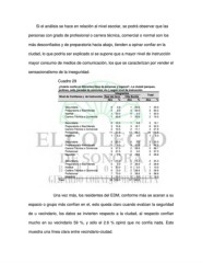 Si el análisis se hace en relación al nivel escolar, se podrá observar que las personas con grado de profesional o carrera técnica, comercial o normal son los más desconfiados y de preparatoria hacia abajo, tienden a opinar confiar en la ciudad, lo que podría ser explicado si se supone que a mayor nivel de instrucción mayor consumo de medios de comunicación, los que se caracterizan por vender el sensacionalismo de la inseguridad. Cuadro 29 ¿Cuánto confía en diferentes tipos de personas y lugares?...La ciudad (parques, jardines, calle, paradas de camiones, etc.), según nivel de instrucción Integrantes Total Nivel de Confianza y de Instrucción Real del Arco Villa Bonita Abs % Abs % Abs % Mucho 2 5.1 5 13.5 7 18.6 Secundaria 0 0.0 1 20.0 1 20.0 Preparatoria o Bachillerato 0 0.0 3 60.0 3 60.0 0.0 Normal 1 1 50.0 0 1 20.0 1 50.0 2 70.0 Carrera Técnica o Comercial 50.0 Poco 19 48.7 18 48.6 37 97.4 Secundaria 2 10.5 1 5.6 3 16.1 Preparatoria o Bachillerato 3 15.8 3 16.7 6 32.5 21.6 4 Carrera Técnica o Comercial 11 2 10.5 12 2 11.1 23 124.6 66.7 Profesional 57.9 Maestría 1 5.3 0 0.0 1 5.3 Ni mucho ni poco 8 2 20.5 7 0 18.9 15 2 39.4 0.0 Secundaria 25.0 25.0 Preparatoria o Bachillerato 0 0.0 3 42.9 3 42.9 Carrera Técnica o Comercial 3 3 37.5 2 0 28.6 5 66.1 Profesional 0.0 37.5 37.5 3 Maestría 0 0.0 2 28.6 2 28.6 Nada 10 25.6 7 18.9 17 44.6 Secundaria 1 0 10.0 1 2 14.3 2 24.3 28.6 0.0 2 28.6 Preparatoria o Bachillerato Normal 1 10.0 0 0.0 1 10.0 0.0 Carrera Técnica o Comercial 0 7 70.0 2 2 28.6 2 28.6 9 98.6 Profesional 28.6 Maestría 1 10.0 0 0.0 1 10.0 Total 39 100.0 37 100.0 Una vez más, los residentes del EDM, conforme más se aceran a su espacio o grupo más confían en el, esto queda claro cuando evalúan la seguridad de u vecindario, los datos se invierten respecto a la ciudad, al respecto confían mucho en su vecindario 59 %, y sólo el 2.6 % opinó que no confía nada. Esto muestra una línea clara entre vecindario-ciudad.