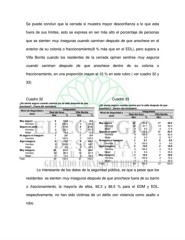 Se puede concluir que la cerrada si muestra mayor desconfianza a lo que esta fuera de sus limites, esto se expresa en ser más alto el porcentaje de personas que se sienten muy inseguras cuando caminan después de que anochece en el exterior de su colonia o fraccionamiento(8 % más que en el EDL), pero supera a Villa Bonita cuando los residentes de la cerrada opinan sentirse muy seguros cuando caminan después de que anochece dentro de su colonia o fraccionamiento, en una proporción mayor al 15 % en este rubro ( ver cuadro 32 y 33). Cuadro 32 Cuadro 33 ¿Se siente seguro cuando camina por la calle después de que anochece?...Fuera del vecindario ¿Se siente seguro cuando camina por la calle después de que anochece?...Dentro del vecindario Nivel de Seguridad y Real del Arco Integrantes Villa Bonita Nivel de Seguridad y Integrantes sexo Abs % Abs % sexo Real del Arco % Villa Bonita % Abs Abs Muy seguro 5 12.8 2 5.4 Hombre 5 100.0 2 28.6 Muy seguro 24 61.5 17 45.9 Seguro en parte 7 17.9 8 21.6 Hombre 22 91.7 14 82.4 Hombre 6 85.7 7 87.5 Mujer 2 8.3 3 17.6 Mujer 1 14.3 1 12.5 Seguro en parte 4 10.3 12 32.4 Ni seguro ni inseguro 1 2.6 2 5.4 Hombre 4 100.0 10 83.3 Hombre 1 100.0 2 100.0 Mujer 0 0.0 2 16.7 Algo inseguro 6 15.4 9 24.3 Ni seguro ni inseguro 2 5.1 0 0.0 Hombre 6 100.0 6 66.7 Hombre 2 100.0 0 0.0 Mujer 0 0.0 3 33.3 Algo inseguro 5 12.8 4 10.8 Muy inseguro 20 51.3 16 43.2 Hombre 5 100.0 3 75.0 Hombre 19 95.0 13 81.3 Mujer 0 0.0 1 25.0 Mujer 1 5.0 3 18.8 Muy inseguro 4 10.3 4 10.8 Total 39100.0 37100.0 Hombre 4 100.0 3 75.0 Mujer 0 0.0 1 25.0 Total 39100.0 37100.0 Lo interesante de los datos de la seguridad pública, es que a pesar que los residentes se sienten muy inseguros después de que anochece fuera de su barrio o fraccionamiento, la mayoría de ellos, 92.3 y 86.5 % para el EDM y EDL, respectivamente, no han sido victimas de un delito con violencia como asalto o robo.