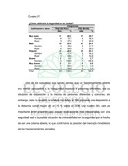 Cuadro 37 ¿Cómo calificaría la seguridad en su ciudad? Integrantes Calificación y sexo Real del Arco Villa Bonita Abs % Abs % Muy mala 11 28.2 11 29.7 Hombre 8 72.7 4 36.4 27.3 3 63.6 7 Mujer Mala 10 25.6 12 32.4 Hombre 4 40.0 5 41.7 Mujer 6 60.0 7 58.3 Regular 14 35.9 13 35.1 Hombre 10 71.4 6 46.2 Mujer Buena 2 4 28.6 1 7 53.8 5.1 2.7 Hombre 2 100.0 1 100.0 Muy buena 2 5.1 0 0.0 Hombre 1 50.0 0 0.0 Mujer 1 50.0 0 0.0 Total 39 100.0 37 100.0 Uno de los supuestos que hacían pensar que un fraccionamiento abierto era menos perceptible a la inseguridad respecto a personas diferentes, era su situación de disposición a la mezcla de personas diferentes y comunes, sin embargo, esto no sucedió, al analizar los datos, el EDL presenta una disposición a la distancia social mayor en un 15 % sobre el EDM (ver cuadro 38), esto es importante tener presente para buscar explicaciones más relacionadas con una seguridad real o la posible situación de vulnerabilidad en la seguridad por el hecho de ser una colonia abierta, lo que confirmaría la posición del mercado inmobiliario de los fraccionamientos cerrados.