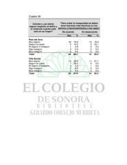 Cuadro 39 “Para evitar la inseguridad se deben Colonia y ¿se siente seguro respecto al delito y tener barreras más efectivas en los la violencia cuando está barrios o fraccionamientos o las casas” solo en su hogar? De acuerdo En desacuerdo Abs % Abs % Real del Arco Muy seguro 20 76.9 10 76.9 Seguro en parte 5 19.2 3 23.1 Ni seguro ni inseguro 1 3.8 0 0.0 0 0.0 0.0 0 Algo inseguro Muy inseguro 0 0.0 0 0.0 Total 26 66.7 13 33.3 Villa Bonita Muy seguro 14 56.0 11 91.7 28.0 7 Seguro en parte 0.0 0 Ni seguro ni inseguro 0 0.0 1 8.3 Algo inseguro 2 8.0 0 0.0 Muy inseguro 2 8.0 0 0.0 Total 25 67.6 12 32.4