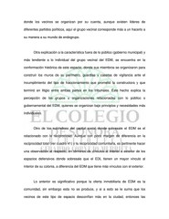 donde los vecinos se organizan por su cuenta, aunque existen lideres de diferentes partidos políticos, aquí el grupo vecinal corresponde más a un hacerlo a su manera a su mundo de endogrupo. Otra explicación a la característica fuera de lo público (gobierno municipal) y más tendiente a lo individual del grupo vecinal del EDM, se encuentra en la conformación histórica de este espacio, donde sus miembros se organizaron para construir los muros de su perímetro, guardias y casetas de vigilancia ante el incumplimiento del tipo de fraccionamiento que prometió la constructora y que terminó en litigio entre ambas partes en los tribunales. Este hecho explica la percepción de los grupos u organizaciones relacionadas con lo público o gubernamental del EDM, quienes se organizan bajo principios y necesidades más individuales. Otro de los subíndices del capital social donde sobresale el EDM es el relacionado con la reciprocidad. Aunque con poco margen de diferencia en la reciprocidad total (ver cuadro 41) y la reciprocidad comunitaria, es pertinente hacer una observación al respecto, en términos de vínculos al interior o exterior de los espacios defensivos donde sobresale que el EDL tienen un mayor vinculo al interior de su colonia, a diferencia del EDM que tiene más vínculos con el exterior. Lo anterior es significativo porque la oferta inmobiliaria de EDM es la comunidad, sin embargo esta no se produce, y si a esto se le suma que los vecinos de este tipo de espacio desconfían más en la ciudad, entonces las