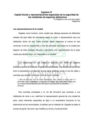 Capítulo IV Capital Social y representaciones espaciales de la seguridad de los residentes de espacios defensivos “Yo Nogales lo veo como tres calles” Nogalense Las representaciones de la ciudad Nogales como frontera, como ciudad que alberga personas de diferentes estados del país debe de entenderse según la visión o representación que sus habitantes tienen de ella. Estas visiones deben separarse al menos en dos versiones: la de los nogalenses y la de las personas asentadas en la ciudad que llegaron de otras ciudades del país y asumieron una representación de la clase media que decidió hacer una “seguridad a su medida” Los nogalenses ven una ciudad en desorden, con déficit de espacios públicos y que es limitada por su geografía accidentada, una ciudad que se debate entre la planeación y el absurdo de sus obras públicas, como el uso de calles y avenidas que también funcionan como arroyos o canales. “...dice mi hija que vive en León Guanajuato, dice, mamá ya tengo qué ir a platicarle a mis compañeros a León que en Nogales hay tanto, tanto dinero que los arroyos los pavimentan, pues dice que es la ciudad de los absurdos...” (Clarisa) Dos avenidas principales y la vía del ferrocarril que conectan a sus habitantes de norte a sur, reafirman la representación general de una ciudad de paso, estos referentes espaciales se ligan a un anecdotario frecuente en los testimonios de los entrevistados, al señalar que el malestar de Nogales se debe al exceso de gente “de fuera” que modifica su forma y funcionamiento.