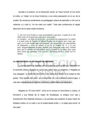 Aunado a lo anterior, en la interacción social se “hace normal” el vivir entre la mafia, un “relajo” en la línea fronteriza y una cierta planeación en el sur de la ciudad. Se construye socialmente una pedagogía urbana de aprender a vivir con la violencia, si y sólo si, “no me meto con nadie”. Todo esto confecciona el ropaje discursivo de la clase media fronteriza. “[...]tú vives en la frontera y estas acostumbrado a que pues...es parte de tu vida diaria verte con la gente que anda en la...en la mafia. yo visualizo... un relajo de sin proyec...sin control, sin organización [ se refiere a la parte norte de Nogales al dibujar Nogales en un papel]; pero como que, aquí...ya se está viendo algo más planeado, una proyección con conocimiento de planeación y todo [se refiere al sur de la ciudad]. Sí. Y...y lo otro pues...desgraciadamente Nogales también está catalogada como muy violenta pues, por la cuestión del narcotráfico, por la cuestión de la...plaza, pero...pero pues, tienes que aprenderá vivir con eso.” (Residente de R.A., mujer de C.S. medio) La representación de los espacio de identidad La funcionalidad de Nogales como ciudad de paso acelera la visibilidad en el recorrido urbano, Nogales es “como tres calles” dice un residente, o “Nogales es muy alargado”, la senda del ferrocarril y tres calles que dividen a la ciudad en dos partes. “Esa rapidez del paso”, se corresponde con una simbólica urbana fugaz, o más bien empobrecida en figuras o símbolos emblemáticos de identidad. Nogales es “El mono bichi”, como se le conoce al monumento a Juárez, el ferrocarril y sus fiestas de la virgen de Guadalupe, la antigua cruz roja y actualmente Ana Gabriela Guevara y los puentes que aceleran el paso hacia los Estados unidos, en un subir y ver la ciudad desde arriba y un bajar para entrar “al otro lado”
