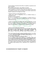 “Tú que opinarías si movieran al mono bichi, si lo quitaran y lo pusieran en otro lugar, ¿te gustaría? Pues no porque es algo histórico, algo simbólico de Nogales P- pero por ejemplo la maquina esa 5001 la han movido varias veces -Pero la maquina no es, es como si, puede existir otra maquina en Hermosillo, otra maquina en Nacozari, pero una escultura como esa pues nomás está en Nogales” (residente de V.B., Mujer de C.S. bajo) “¿entonces lo llevaría a la calle Gabriela Guevara? - Donde está la calle, la Campodónico, ésa no es Gabriela Guevara, es Campodónico [risas] ¿La gente no se ha acostumbrado? No, ni se va a acostumbrar, no, es la campodónico, la Gabriela Guevara es aparte, es otra persona [ahí está su monumento ahí pasas, dice su esposa] cuando pasas por aquí. [...]todos los ferrocarrileros les pegaban como unas diez plataformas, y en una de ellas, en la primera, ponían a la virgen, e iba un montón de gente ahí con de esos, como se llaman, con bengalas, con bengalas no, y ya la demás gente, se subía en los demás bagones,” (residente de V.B. , Hombre de C.S. medio) “como la ve con los puentes que construyeron Ha muy mal [muy mal replica] los free wall esos, mal porque arriba circulan pero abajo todo lo que se mira todo lo que es los drenajes mal tapados, mal hechos, sea, si hay vialidad, no” (residente de V.B., Mujer de C.S. bajo) “Pues porque estamos encerrados, estamos encajonados, estamos en una cañada y te ponen a hacer un distribuidor vial donde no tienes campo, que es lo que tienes que hacer, reducir la calle. P.- ¿pero ahora no resultan más, no reducen el tiempo? No, no, al contrario, como te diré, obstruyen y te confunden, cuánta gente todavía no sabe usar el distribuidor vial de la Buenos Aires, infinidad de gente, hasta yo mismo una vez me metí mal, por falta de señalamientos, ése es el problema pues que tenemos aquí en Nogales de toda la vida, el espacio, porque, por lo mismo, estamos en una cañada, en un cañón, Nogales se fue fundando en una cañadita cerrada rodeada de cerros.” (Residente de V.B. , Hombre de C.S. medio). Las representaciones de la “maquila” y la migración