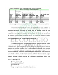 Cuadro 2 Capital social, Indice de seguridad y mapa cognitivo de la colonia Real de Arco: Espacio Defensivo Manifiesto Percepción de la Evaluación de Indice de Capital seguridad la seguridad seguridad Tipo de Mapa de la Social (rango 0 a 6) (rango 0 a 12) (rango 0 a 18) Sexo colonia 1 Baj o 5 Alta 6 Media 11Medio Hombre Itinerante 2 Bajo 3 Media 5 Media 8 Medio Mujer Global 3 Medio 5 Alta 7 Media 12 Medio Hombre Global 4 Medio 6 Alta 9 Alta 15 Alto Mujer Global 5 Alto 5 Alta 9 Alta 14 Alto Hombre Global 6 Alto 6 Alta 10 Alta 16 Alto Mujer Itinerante Elaboración propia con base en entrevista y elaboración de mapas cognitivos de los residentes del EDM. El residente 1 del cuadro 2, hombre, de Capital Social bajo, de EDM, es originario de Nayarit, tiene más de veinte años en Nogales, trabaja en una maquiladora como operador, comentó que su relación es más con los compañeros de la fabrica que con los de la colonia, esta es una explicación al mapa cognitivo itinerante que elaboró (ver anexo; croquis de la colonia 7). El mapa cognitivo que el residente en mención elaboró carece de casas habitación, sólo calles y los puntos emblemáticos del fraccionamiento, haciendo énfasis y enumerando en primer lugar la entrada al fraccionamiento como principal punto de referencia. La entrada está compuesta por dos grandes arcos emulando una entrada medieval, intenta inspirar fortaleza, da “vista” dice el residente, lo que significa “fachada”, estética, seguido de la glorieta y finalmente el parque (ver anexo: mapa cognitivo). “El Arco, ¿pa onde está?, ¿La calle del Real del Arco? ¿Es la entrada ahí? Sí. Y luego por aquí está la…. (Inaudible). Aquí esta un…