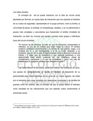Las redes sociales El concepto de red se puede relacionar con la idea de círculo social planteado por Simmel, en cuanto tipos de interacción que van sacando al individuo de su núcleo de seguridad, representado en el grupo primario, como la familia, la comunidad de pares, la amistad, el compadrazgo, etcétera, y se va adicionando a grupos más complejos o secundarios que trascienden el ámbito inmediato de interacción, es decir los vínculos que tienden puentes entre grupos e individuos fuera del circulo inmediato. “El número de los diversos círculos en que se encuentra comprendido el individuo, es uno de los índices que mejor miden la cultura. El hombre moderno pertenece primeramente a la familia de sus padres; luego, a la fundada por él, y, por consiguiente, a la de su mujer; después, a su profesión, que ya, por sí sola, le ligará muchas veces a diversos círculos de interés [...]; sabe que es ciudadano y que además pertenece a una determinada clase social, pudiendo ser, por añadidura, oficial de complemento, pertenecer a un par de sociedades y hacer una vida de 9 relación que le ponga en contacto con diversos círculos.” Las redes definen la estructura social que crearán los individuos, es decir, sus pautas de comportamiento en donde el individuo se desprende de su particularidad pero diferenciándose de los otros de su misma especie, las redes son el elemento para crear sociedad con desenlaces vinculantes o de tendida de puentes entre los actores, bajo el principio de que el grupo define al individuo como resultado de las interacciones que van tejiendo nudos conformando el entramado social. 9 Georg Simmel, Sociología, estudios sobre las formas de socialización volumen II, Biblioteca de la revista de occidente, Madrid, España, 1977, p. 434.