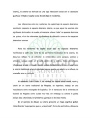 colonia), lo anterior es derivado de una baja interacción social con el vecindario que hace limitado el capital social de este tipo de residentes. Las diferencias entre los residentes de capital bajo de espacio defensivos Manifiesto, respecto al espacio defensivo latente, es que aquel ha asumido otro significado de la calle o la cuadra, el referente urbano “calle” no aparece dentro de los gustos, ni en los referentes significativos de ubicación como en los espacios defensivos latentes. Para los residentes de capital social bajo de espacios defensivos manifiestos la calle esta fuera de los perímetros bardeados de la colonia, los discursos reflejan “lo de enfrente”, lo emblemático como parques, jardines y símbolos, aunque estén en la calle, dentro de la colonia. Estos comentarios reflejan que la calle o la cuadra pierde sentido de identidad y limite, a la usanza de la colonia tradicional, ahora la identidad es una puerta, un adentro y un afuera, no una calle, sino un conjunto. El residente 3 del Cuadro 1, es hombre, de capital social medio, nació y creció en un barrio tradicional de Nogales, es ingeniero, trabaja en una maquiladora como encargado de Logística. En el transcurso de la entrevista se expresó de Nogales como ciudad muy fea, sin embargo su colonia le gusta, porque esta urbanizada, sin problemas y porque es de clase media. En el ejercicio de dibujar su colonia presentó un mapa cognitivo global, inicia diciendo “supongamos que es una privada”, forma los perímetros, ubica una