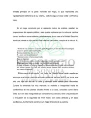 entrada principal en la parte noroeste del mapa, lo que representa una representación defensiva de su colonia, esto le sigue el área verde y al final su casa. En el mapa construido por el residente motivo de análisis, resaltan las proporciones del espacio público y esto puede explicarse por la rutina de caminar con su familia en zonas abiertas, principalmente de su casa a la Unidad Deportiva Municipal, donde su hijo practica Tae kwan do (ver anexo: croquis de la colonia 3). “Cómo te voy a decir si ya no me gusta Nogales? yo me iría allá a Guadalajara yo ya no quiero nada con Nogales. Es una ciudad muy fea ya [...]” P.- ¿esos son los perímetros? “Suponer como si fuera una privada Éste es el parque P.- De la colonia ¿cuáles son los lugares que más le gustan a usted? El parque más bien, es donde van y se distraen un poco [...] ahí es donde se la llevan jugando y ahí es donde hacen todas sus reuniones, ahí mismo juegan foot ball, ahí mismo juegan basquet ball, nosotros mismos nos vamos a jugar ahí” El informante 4 del cuadro 1, es mujer, de Capital Social medio, nogalense, se ocupa en el hogar, participa en la asociación de Vecinos (AVES), es viuda, vive sólo una hija con ella de 19 años y comentó tener salidas poco frecuentes. Durante la entrevista fue muy marcada su molestia e inseguridad hacia los condominios de tres plantas situados frente a su casa, conocidos como Sierra Vista, aun con esta inseguridad que considera muy cercana, tiene una percepción y evaluación de la seguridad de nivel medio. Con estos atributos y en estas condiciones, la informante construyó un mapa itinerante de su colonia.