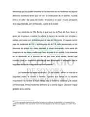 diferencias que se pueden encontrar en los discursos de los residentes de espacio defensivo manifiesto tienen que ver con la construcción de un adentro, “cuando entro a mi calle”, “las casas del medio”, “el acceso a mi casa”. Es una percepción de la seguridad alta, pero enfrascada, a parte de la ciudad. Los residentes de Villa Bonita al igual que los de Real del Arco, tienen el gusto por el parque y evalúan la colonia a manera de cerrada con entradas y salidas, pero estas son simbólicas para el caso de Villa bonita. El espacio común para los residentes de R.A. y público para los de V.B. está representado en los discursos de ambos con cierta opacidad, a veces amenazado, como parte del imaginario de las clases medias que tratan de evitar el sin sentido. Este sinsentido se ve disminuido en el discurso de los que viven entre bardas, barrera que funciona como un dispositivo material que está alimentando la percepción alta de seguridad aunque la inseguridad real esté presente 101 . Los residentes de capital social alto 5 y 6 del cuadro 1 tienen un nivel de se seguridad medio, el número 5 hombre, ingeniero que trabaja en la industria maquiladora. La numero 4 mujer trabaja para el Gobierno Municipal y de estado civil divorciada. Ambos residentes definieron a su colonia segura y trazaron mapas globales de su colonia. 101 Ya fue comentado en párrafos más arriba, los sucesos de ambiente de narcotráfico y el secuestro de un residente de Real del Arco, encontrado muerto diez días después en las afueras de nogales, en octubre de de 2007.