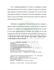 Ante la seguridad-Inseguridad de la colonia, los poseedores de capital social bajo de Real del arco del cuadro 2, reafirman lo seguro con los sitios que dijeron gustarles, el informante hombre ve la seguridad en el arco de la entrada donde están los guardias y la informante mujer ubica la seguridad en el parque frente a su casa, el que declaro como único sitio de su gusto de la colonia (ver anexos: croquis de la colonia 6). Refiriéndose a la inseguridad, el informante hombre ubicó como insegura la esquina noroeste de su colonia por que pasa un arroyo (ver anexo: croquis de la colonia 6) y en lo general no hay inseguridad porque todo esta cerrado, comentó. En este mismo cuestionamiento la informante mujer expresó que los sitios inseguros de la colonia son los perímetros del fraccionamiento, porque dijo son los de más tráfico, además tiene partes sin barda para que salga el arroyo y permite la entrada de gente de fuera de la colonia. ¿Lo que más le proporciona seguridad? ¿Seguridad? “El alumbrado, todo el alumbrado, todo.” El alumbrado, ¿pero qué partes de la…colonia….? “Pues la entrada porque aquí están los guardias ¿no? La entrada. La entrada….” Esto sería lo más seguro…. ¿Y después de eso, qué sería más seguro, habría otra cosa? “Pues yo creo que…que no….” (Residente de R.A., hombre, de C.S. bajo). “¿qué parte del fraccionamiento considera usted que es….eee….más segura? “Mmmm….pues… ¿segura, segura?, pues no…” Bueno, que usted considere más que todas…que las demás ¿no? “Pues el parque, yo diría, sí… El parque…” (Residente de R.A., mujer, de C.S. bajo). ¿Qué partes… a usted se les hace….se le hacen, más inseguras?