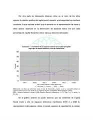 Por otra parte es interesante observar cómo en el rubro de los sitios opacos, la relación positiva del capital social respecto a la inseguridad se mantiene constante, lo que equivale a decir que el aumento en la representación de zonas y sitios opacos repercute en la disminución de espacios claros (ver por cada porcentaje de Capital Social los rubros claros y obscuros del cuadro) Evaluación y conocimiento de los espacios urbanos de la ciudad de Nogales según tipo de espacio defensivo y nivel de Capital Social 60 50 40 Porcentaje 30 20 10 0 EDL 1 EDM 1 EDL 2 EDM 2 EDL 3 EDM 3 Tipo de espacio defensivo y nivel de Capital Social Que conoce N.conoce Claros Opacos Elaboración con base en entrevistas, para la tesis de Doctorado: Capital social y seguridad urbana en espacios defensivos de clase media de la ciudad de Nogales, por Ramón Alberto Jorquera Limón. EDL = Espacio Defensivo Latente; EDM= Espacio Defensivo Manifiesto; 1= C.S. bajo 2= C.S. medio; 3= C.S alto. En el gráfico anterior se puede observar que los residentes de Capital Social medio y alto de espacios defensivos manifiestos (EDM 2 y EDM 3), representaron más espacios claros y menos espacios de opacidad de la ciudad,
