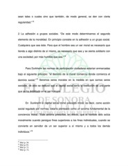 sean tales o cuales sino que también, de modo general, se den con cierta 13 regularidad.” 2 La adhesión a grupos sociales. “De este modo determinamos el segundo elemento de la moralidad. En principio consiste en la adhesión a un grupo social. Cualquiera que sea éste. Para que el hombre sea un ser moral es necesario que tienda a algo distinto de sí mismo, es necesario que sea y se sienta solidario con 14 una sociedad, por más humilde que sea.” Para Durkheim las normas de participación ciudadana estarían enmarcadas bajo el siguiente principio: “el dominio de la moral comienza donde comienza el 15 dominio social.” Seremos seres morales en la medida en que somos seres sociales, de esto se deduce que el capital social sería la restitución de una parte que se ha debilitado en el ser humano. En Durkheim el capital social como precepto moral, es decir, como acción social regulado por normas, estaría planteado como un axioma fundamental de la conciencia moral. “Este axioma prescribe, en efecto, que el hombre sólo actúa moralmente cuando persigue fines superiores a los fines individuales, cuando se convierte en servidor de un ser superior a sí mismo y a todos los demás 16 individuos.” 13 Ibid. p. 34. 14 Ibid. p. 91. 15 Ibid. p. 71. 16 Ibid. p. 72.
