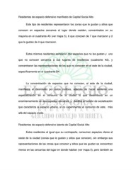 Residentes de espacio defensivo manifiesto de Capital Social Alto Este tipo de residentes representaron los zonas que le gustan y sitios que conocen en espacios cercanos al lugar donde residen, concentrados en su mayoría en el cuadrante A5 (ver mapa 5), 6 que conocen de 7 que marcaron y 2 que le gustan de 4 que marcaron. Estos mismos residentes señalaron dos espacios que no les gustan y uno que no conocen cercanos a sus lugares de residencia (cuadrante A5), y concentraron las representaciones de los que no conocen en el este de la ciudad, específicamente en el cuadrante B4. La concentración de espacios que no conocen, al este de la ciudad, manifiesta el desinterés por estos rumbos, además de hacer evidente una especialización en el consumo de la ciudad lo que desemboca en un ensimismamiento en sus espacios cercanos, y, debilita la función de socialización que caracteriza al espacio urbano, al no experimentar el consumo de este, más allá del espacio vivido. Residentes de espacio defensivo latente de Capital Social Alto Estos residentes al igual que su contraparte, consumen espacios claros al oeste de la ciudad (zonas que le gustan y sitios que conocen), sin embargo sus representaciones de las zonas que conocen y sitios que les gustan se concentran menos en las cercanías del lugar en donde habitan (ver mapa 5), pero también se