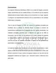Conclusiones Los espacios Defensivos Manifiestos (EDM), de la ciudad de Nogales, presentan rasgos característicos de las ciudades difusas, en el sentido de que los espacios habitacionales de clases medias y altas ya no se concentran en un lugar especial, o configuran una especialización territorial como se presentaban en las ciudades tradicionales o compactas. Para el caso de Nogales los EDM, son racimos de vialidades principales que manifiesta más su defensa en términos físicos al sumarse al encierro las características accidentadas de la topografía que crea lugares intersticiales. Las vialidades principales garantizan que la distancia del lugar de los EDM se incremente y que se sitúen en las periferias de la ciudad rodeados de espacios con características disímiles, lo que hace más evidente la diferenciación social, como se vio con las variables instrucción e ingreso en las georeferencias presentadas en el capitulo dos. La ciudad de Nogales esta marcada por una clara división socioterritorial, un gran espacio al este de las vías del ferrocarril que cruza la ciudad de sur a norte, este territorio concentra el mayor número de espacios urbanos con más alto nivel de segregación residencial por ingreso y por instrucción escolar a diferencia de la parte oeste.