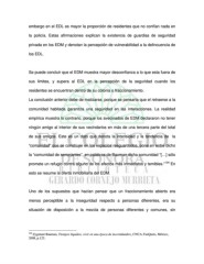 embargo en el EDL es mayor la proporción de residentes que no confían nada en la policía. Estas afirmaciones explican la existencia de guardias de seguridad privada en los EDM y denotan la percepción de vulnerabilidad a la delincuencia de los EDL. Se puede concluir que el EDM muestra mayor desconfianza a lo que esta fuera de sus limites, y supera al EDL en la percepción de la seguridad cuando los residentes se encuentran dentro de su colonia o fraccionamiento. La conclusión anterior debe de matizarse, porque se pensaría que el retraerse a la comunidad habitada garantiza una seguridad en las interacciones. La realidad empírica muestra lo contrario, porque los avecinados de EDM declararon no tener ningún amigo al interior de sus vecindarios en más de una tercera parte del total de sus amigos. Este es un dato que denota la intensidad y la tendencia de la “comunidad” que se construye en los espacios resguardados, pone en entre dicho la “comunidad de semejantes”, en palabras de Bauman dicha comunidad “[…] sólo promete un refugio contra alguno de los efectos más inmediatos y temibles.” 104 En esto se resume la oferta inmobiliaria del EDM. Uno de los supuestos que hacían pensar que un fraccionamiento abierto era menos perceptible a la inseguridad respecto a personas diferentes, era su situación de disposición a la mezcla de personas diferentes y comunes, sin 104 Zygmunt Bauman, Tiempos líquidos, vivir en una época de incertidumbre, CNCA-TusQuets, México, 2008, p.125.