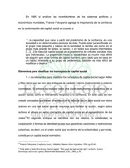 En 1995 al analizar las incertidumbres de los sistemas políticos y económicos mundiales, Francis Fukuyama agrega la importancia de la confianza en la conformación del capital social en cuanto a: “...la capacidad que nace a partir del predominio de la confianza, en una sociedad o en determinados sectores de ésta. Puede estar personificada en el grupo más pequeño y básico de la sociedad, la familia, así como en el grupo más grande de todos, la nación, y en todos sus grupos intermedios [...] [...] Se basa [el capital social] en el predominio de virtudes sociales más que individuales. La propensión hacia la sociabilidad es mucho más difícil de adquirir que otras formas de capital humano, pero dado que se basa en un hábito inherente a su grupo de pertenencia, también es más difícil de 20 modificar o destruir.” Elementos para clasificar los conceptos de capital social 1 - Los elementos para clasificar los conceptos de capital social según Adler y Woo tiene que ver con dos enfoques de carácter interno (instrumental) o externo (normativo). El primero se traduce como una visión instrumental o valorativa de la acción social, como el intercambio recíproco y la confianza. En este caso se han creado conceptos que tienen el enfoque en la relación de un actor social con otros actores en una red social usando recursos que facilitan la acción, según estos autores el abuso en estos conceptos de capital social es el egocentrismo de las 21 redes. El segundo enfoque se identifica con los valores, la solidaridad, la cooperación o formas de identidad grupal que garantizan sanciones o restricciones colectivas, es decir, es el orden social que se deriva de la colectividad, y por ende, constituye un capital social normativo. 20 Francis Fukuyama, Confianza (trust), Atlántida, Buenos Aires Argentina, 1996, pp.45,46. 21 Paul Adler y Seok-Woo Kwon, Social capital: “The good, the bad and the ugli”, en EricL. Lesser, Knowledge and social capital, Butterworth Heinemann, USA, 2000, p. 90.