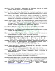 Kaztman R. (2001).“Seducidos y abandonados: el aislamiento social de los pobres urbanos”, Revista CEPAL, no. 76, Santiago de Chile. Lacarrieu, Mónica B. y Thuillier, Guy (2001). “las urbanizaciones privadas en Buenos Aires y Su significación”, revista Perfiles Latinoamericanos, México, D.F, FLACSO. Larsen Larissa, et al. (2004). “Bonding and bridging understanding the relationship between social capital and civic action”, en Journal of Planning Education and Research, No 24, Association of Collegiate Schools of Planning, Phoenix, USA. Lechner Norbert (2000). “Desafíos de un desarrollo humano: individualización y capital social”, en Kliksberg y Tomassini (compildores), Capital social y cultura: claves estratégicas para el desarrollo, BID, Fundación Felipe Herrera, Universidad de Maryland, Fondo de cultura económica, Buenos Aires, Argentina. Lesser Eric L (2000). Knowledge and social capital, Butterworth Heinemann, USA. Lindón Alicia (2005). “De la utopía de la periferia a las geografías personales”, en revista Ciudades, No 65, Puebla México. López Levi, Liliana (2005). “Nogales, Ciudad y Frontera: el sentido del encierro”, en revista imagínales, Hermosillo, México, Universidad de Sonora. Low, Shetha (2003) Venid the gates. Life, Security, and the Pursuit of Happiness in Fortress America, U.S.A., routledge. Makowski, Sara (2003). “Alteridad, exclusión y ciudadanía. Notas para una reescritura del espacio público”, en Patricia Ramírez Kuri (coordinadora), Espacio público y reconstrucción de la ciudadanía, Porrua editores, México. Méndez Sáinz Eloy (2007), Paisajes y arquitecturas de la exclusión, Universidad Autónoma de Madrid, Madrid España. ______ (2002). “Espacios de simulación”, en Luis F. Cabrales, coord., Latinoamérica: países abiertos ciudades cerradas, Guadalajara, México, Universidad de Guadalajara/UNESCO. Millán, Réne y Gordon, Sara (2004). “Capital social: una lectura de tres perspectivas clásicas”, Revista Mexicana de Sociología, UNAM, México D.F. Mora Minor Salas y Pérez Sáenz Juan Pablo (2006). “Dela vulnerabilidad social al riesgo de empobrecimiento de los sectores medios: un giro conceptual y metodológico”, en Revista Estudios Sociológicos, No. 70 El Colegio de México, México, D.F. Nieto Huertas, Lucia (2003) Revista Circunstancia, No. 2, Instituto Universitario de Investigación Ortega y Gasset, Madrid, España, http://www.ortegaygasset.edu/circunstancia/numero2/art6.htm