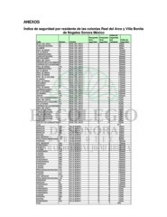 ANEXOS Índice de seguridad por residente de las colonias Real del Arco y Villa Bonita de Nogales Sonora México Indice de Percepción Evaluación seguridad de la de la por Indice de seguridad Calle Número Colonia seguridad 2 seguridad 2 residente 4 Bajo REAL DEL ARCO BLVD. DEL ARCO 30 CONQUISTADORES 88 REAL DEL ARCO 2 2 3 4 5 Bajo ALAMBRE 41 6 Bajo REAL DEL ARCO REAL DE MINAS 81 REAL DEL ARCO 2 3 5 4 7 Medio 7 Medio DE LA ABADIA 93 REAL DEL ARCO COMENDADORES 33 REAL DEL ARCO 5 3 2 5 7 Medio REAL DEL ARCO CONQUISTADORES 38 8 Medio DELAHALAMRA 45 REAL DEL ARCO 3 5 5 3 8 Medio REAL DEL ARCO 8 Medio REAL DEL ARCO 36 PRIVADA DE LA ALHAMERA52 REAL DEL ARCO 4 5 9 Medio CERRADA DE LAS MISIONE51 REAL DEL ARCO 4 5 5 4 9 Medio 9 Medio REAL DE MINAS 105 REAL DEL ARCO COMENDADORES 56 REAL DEL ARCO 5 5 4 4 9 Medio 9 Medio DE LA ABADIA 96 REAL DEL ARCO REAL DE MINAS 41 REAL DEL ARCO 4 6 6 4 10 Medio REAL DEL ARCO 10 Medio REAL DE MINAS 22 PRIV. DE LA COLONIA 32 REAL DEL ARCO 4 5 7 6 11 Medio ALHAMRA 55 REAL DEL ARCO 11 Medio REAL DE MINAS 63 REAL DEL ARCO 5 5 6 6 11 Medio 11 Medio REAL DEL ARCO DELAMBRA 39 MISIONES 80 REAL DEL ARCO 5 6 11 Medio REAL DE MINAS 97 REAL DEL ARCO 5 6 6 5 11 Medio 11 Medio COMENDADORES 1 REAL DEL ARCO DE LA HALAMRA 53 REAL DEL ARCO 5 7 12 Medio ALHAMBRA 49 REAL DEL ARCO 5 7 12 Medio ABADIA 108 REAL DEL ARCO 5 7 12 Medio DE LOS COMENDADORES 52 REAL DEL ARCO 3 10 13 Alto REAL DEL ARCO 33 REAL DEL ARCO 5 8 13 Alto PRIVADA DE LA COLONIA 49 REAL DEL ARCO 5 8 13 Alto DE LA AVADIA 107 REAL DEL ARCO 5 8 13 Alto CERRADA DE LAS MISIONE96 REAL DEL ARCO 5 9 14 Alto REAL DEL ARCO 51 REAL DEL ARCO 5 9 14 Alto DE LAS COLONIAS 48 REAL DEL ARCO 5 9 14 Alto CONQUISTADORES 63 REAL DEL ARCO 5 9 14 Alto DE LAS MISIONES 2 REAL DEL ARCO 6 8 14 Alto CONQUISTADORES 57 REAL DEL ARCO 5 10 15 Alto CONQUISTADORES 63 REAL DEL ARCO 6 9 15 Alto MISIONES 94 REAL DEL ARCO 6 9 15 Alto AVE DE LOS CONQUISTADO45 REAL DEL ARCO 6 10 16 Alto Total 421 MIRADOR 76A VILLA BONITA 0 0 0 Bajo MIRADOR S/N VILLA BONITA 0 2 2 Bajo MIRADOR 98B VILLA BONITA 0 3 3 Bajo MIRADOR 98A VILLA BONITA 2 3 5 Bajo ENCINAL 24 VILLA BONITA 3 3 6 Bajo AVE MIRADOR 104A VILLA BONITA 4 2 6 Bajo PROLONGACION ENCINAL 17B VILLA BONITA 5 1 6 Bajo PRADERA 2 VILLA BONITA 3 4 7 Medio AVE. MIRADOR 94A VILLA BONITA 3 4 7 Medio HONDONADA 33B VILLA BONITA 4 4 8 Medio MIRADOR 82 VILLA BONITA 4 4 8 Medio LAGUNA 27B VILLA BONITA 5 3 8 Medio HONDONADA 19A VILLA BONITA 2 7 9 Medio LAGUNA 26A VILLA BONITA 3 6 9 Medio LAGUNA 17A VILLA BONITA 4 5 9 Medio MIRADOR 88B VILLA BONITA 4 5 9 Medio HONDONADA 30B VILLA BONITA 5 4 9 Medio HONDONADAS 28A VILLA BONITA 4 6 10 Medio PRADERAS 38A VILLA BONITA 4 6 10 Medio LAGUNA 21A VILLA BONITA 4 6 10 Medio LAGUNA 253 VILLA BONITA 5 5 10 Medio PROLONGACION ENCINAL 13A VILLA BONITA 5 5 10 Medio ENCINAL 11A VILLA BONITA 5 5 10 Medio LAGUNA 25A VILLA BONITA 4 7 11 Medio AVE. MIRADOR 119A VILLA BONITA 5 6 11 Medio PROLONGACION ENCINAL 11B VILLA BONITA 5 6 11 Medio PRADERAS 5B VILLA BONITA 5 6 11 Medio MIRADOR 82 VILLA BONITA 5 6 11 Medio HONDONADA 35A VILLA BONITA 4 8 12 Medio LAGUNA 20B VILLA BONITA 5 7 12 Medio HONDONADA 27B VILLA BONITA 5 8 13 Alto HONDONADA S/N VILLA BONITA 6 7 13 Alto HONDONADA 26B VILLA BONITA 6 7 13 Alto LAGUNA 27A VILLA BONITA 5 9 14 Alto PRADERA 28B VILLA BONITA 5 9 14 Alto ENCINAL 8B VILLA BONITA 5 9 14 Alto HONDONADA 25A VILLA BONITA 5 9 14 Alto Total 345