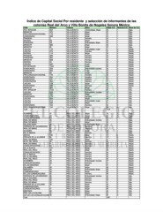 Índice de Capital Social Por residente y selección de informantes de las colonias Real del Arco y Villa Bonita de Nogales Sonora México Calle Número Colonia Sexo Indice C.S Nivel de C:S Nivel de C:S AVE. MIRADOR 94A VILLA BONITA Entrevistado: Mujer 20 1 Bajo MIRADOR S/N VILLA BONITA Mujer 22 1 Bajo PROLONGACION ENCINAL 11B VILLA BONITA Mujer 22 1 Bajo HONDONADA 33B VILLA BONITA Mujer 24 1 Bajo PRADERA 2 VILLA BONITA Hombre 24 1 Bajo ENCINAL 8B VILLA BONITA Mujer 25 1 Bajo PRADERAS 5B VILLA BONITA Entrevistado: Mujer 26 1 Bajo MIRADOR 98B VILLA BONITA Mujer 28 1 Bajo MIRADOR 82 VILLA BONITA Mujer 30 1 Bajo LAGUNA 17A VILLA BONITA Entrevistado: mujer 31 2 Medio LAGUNA 27A VILLA BONITA Hombre 31 2 Medio ENCINAL 11A VILLA BONITA Mujer 32 2 Medio PRADERA 28B VILLA BONITA Hombre 32 2 Medio PRADERAS 38A VILLA BONITA Hombre 32 2 Medio MIRADOR 88B VILLA BONITA Hombre 33 2 Medio ENCINAL 24 VILLA BONITA Hombre 34 2 Medio LAGUNA 26A VILLA BONITA mujer 34 2 Medio AVE MIRADOR 104A VILLA BONITA mujer 35 2 Medio HONDONADA 30B VILLA BONITA Entrevistado: hombre 35 2 Medio HONDONADA 35A VILLA BONITA mujer 35 2 Medio MIRADOR 82 VILLA BONITA mujer 36 2 Medio PROLONGACION ENCINAL 17B VILLA BONITA Hombre 36 2 Medio HONDONADA 25A VILLA BONITA Hombre 37 2 Medio HONDONADA S/N VILLA BONITA Hombre 37 2 Medio HONDONADAS 28A VILLA BONITA Hombre 37 2 Medio LAGUNA 27B VILLA BONITA mujer 38 2 Medio HONDONADA 26B VILLA BONITA Hombre 39 2 Medio MIRADOR 98A VILLA BONITA Mujer 43 3 Alto AVE. MIRADOR 119A VILLA BONITA Hombre 45 3 Alto LAGUNA 20B VILLA BONITA Entrevistado: hombre 45 3 Alto MIRADOR 76A VILLA BONITA Mujer 45 3 Alto HONDONADA 27B VILLA BONITA Hombre 46 3 Alto LAGUNA 25A VILLA BONITA Mujer 46 3 Alto LAGUNA 21A VILLA BONITA Entrevistado: mujer 47 3 Alto LAGUNA 25B VILLA BONITA Mujer 51 3 Alto HONDONADA 19A VILLA BONITA Hombre 52 3 Alto PROLONGACION ENCINAL 13A VILLA BONITA Mujer 53 3 Alto Total 1318 ALAMBRE 41 REAL DEL ARCO Mujer 18 1 Bajo COMENDADORES 33 REAL DEL ARCO Mujer 20 1 Bajo CONQUISTADORES 63 REAL DEL ARCO Mujer 22 1 Bajo REAL DE MINAS 65 REAL DEL ARCO Entrevistado: hombre 24 1 Bajo REAL DE MINAS 81 REAL DEL ARCO Mujer 24 1 Bajo DELAHALAMRA 45 REAL DEL ARCO Entrevistado: Mujer 26 1 Bajo CERRADA DE LAS MISIONES 51 REAL DEL ARCO Hombre 27 1 Bajo REAL DE MINAS 97 REAL DEL ARCO Hombre 27 1 Bajo ALHAMRA 55 REAL DEL ARCO Mujer 28 1 Bajo DE LA ABADIA 93 REAL DEL ARCO Hombre 29 1 Bajo ABADIA 108 REAL DEL ARCO Mujer 31 2 Medio PRIVADA DE LA ALANBRA 52 REAL DEL ARCO Hombre 31 2 Medio REAL DE MINAS 105 REAL DEL ARCO Mujer 31 2 Medio BLVD. DEL ARCO 30 REAL DEL ARCO Hombre 32 2 Medio REAL DE MINAS 41 REAL DEL ARCO Hombre 32 2 Medio CONQUISTADORES 63 REAL DEL ARCO Hombre 33 2 Medio DE LA AVADIA 107 REAL DEL ARCO Mujer 33 2 Medio REAL DEL ARCO 36 REAL DEL ARCO Mujer 33 2 Medio CONQUISTADORES 88 REAL DEL ARCO Hombre 34 2 Medio DE LA ABADIA 96 REAL DEL ARCO Hombre 34 2 Medio DE LA HALAMRA 53 REAL DEL ARCO Hombre 34 2 Medio REAL DEL ARCO 51 REAL DEL ARCO Hombre 35 2 Medio ALHAMBRA 49 REAL DEL ARCO Entrevistado: hombre 37 2 Medio CONQUISTADORES 38 REAL DEL ARCO Hombre 37 2 Medio DE LAS MISIONES 2 REAL DEL ARCO Mujer 37 2 Medio DELAMBRA 39 REAL DEL ARCO Mujer 38 2 Medio MISIONES 94 REAL DEL ARCO Entrevistado: Mujer 38 2 Medio COMENDADORES 56 REAL DEL ARCO Mujer 39 2 Medio DE LOS COMENDADORES 52 REAL DEL ARCO Hombre 39 2 Medio CERRADA DE LAS MISIONES 96 REAL DEL ARCO Entrevistado: hombre 40 3 Alto DE LA COLONIA 48 REAL DEL ARCO Hombre 40 3 Alto REAL DEL ARCO 33 REAL DEL ARCO Hombre 40 3 Alto REAL DE MINAS 22 REAL DEL ARCO Hombre 41 3 Alto PRIVADA DE LA COLONIA 49 REAL DEL ARCO Mujer 43 3 Alto COMENDADORES 1 REAL DEL ARCO Mujer 48 3 Alto CONQUISTADORES 57 REAL DEL ARCO Mujer 49 3 Alto MISIONES 80 REAL DEL ARCO Mujer 49 3 Alto PRIV. DE LA COLONIA 32 REAL DEL ARCO Mujer 52 3 Alto AVE DE LOS CONQUISTADORE45 REAL DEL ARCO Entrevistado: Mujer 56 3 Alto Total 1361