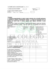 1 ¿La familia cuenta con automóvil propio? Si...1 No...2 2 ¿Cuántos autos tiene la familia? 3 Modelo Más reciente 4 ¿Cuál es el ingreso familiar semanal? 5 a 10 mil...1 10 a 15 mil...2 15 o más...3 otro. .. 4 Especifique__________________ 1 Grupos 1.1 Iniciaría preguntándole si usted o algún miembro de su familia pertenece o participa en alguna organización formal, o a grupo de personas que se reúnen en forma más o menos regular para alguna actividad o para conversar. Mientras leo el listado de los grupos u organizaciones dígame usted que miembro de la familia pertenece a estos y que tan activo es y si participa en la toma de decisiones. Tipo de organización o Nombre de la Código del ¿Qué tan activa es la grupo organización o miembro de participación de esta grupo familia más persona en la toma de activo decisiones del grupo? 1 = Líder 2 = Muy activa 3 = Algo activa 4 = No participa en la toma de decisiones A. Grupo o cooperativa C. Asociación comercial o de comerciantes D. Asociación profesional (médicos, profesores, ingenieros, etc.) E. Sindicato F. Comité o asociación vecinal/ del barrio o fraccionamiento G. Grupo religioso o espiritual (por ejemplo iglesia, templo, grupo religioso informal, grupo de estudio religioso, vela perpetua, catequistas, etc.) H Grupo o movimiento político (unión de usuarios, derechos humanos, partido, etc.) I. Asociación o grupo cultural (por ejemplo arte, música, teatro, cine) J. Grupo de finanzas, créditos o ahorros, “tandas” o “cundinas”, cafés de ahorro del barrio o cerrada, sociedad de ahorro, asociaciones de crédito etc.