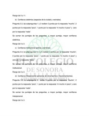 Rango de 0 a 11. b) Confianza sistémica (espacios de la ciudad y vecinales). Pregunta 3.3, las subpreguntas 1 y 2 reciben 3 puntos por la respuesta “mucho”, 2 puntos por la respuesta “poco”, 1 punto por la respuesta “ni mucho ni poco” y cero por la respuesta “nada”. Se suman los puntajes de las preguntas, a mayor puntaje, mayor confianza sistémica. Rango de 0 a 3. c) Confianza institucional (policía y servicios). Pregunta 3.3, la subpreguntas 3, 4 y 5 reciben 3 puntos por la respuesta “mucho”, 2 puntos por la respuesta “poco”, 1 punto por la respuesta “ni mucho ni poco” y cero por la respuesta “nada”. Se suman los puntajes de las preguntas, a mayor puntaje, mayor confianza institucional. Rango de 0 a 3. d) Confianza interpersonal (personas de otros barrios o fraccionamientos). Pregunta 3.3, la subpregunta 6 recibe 3 puntos por la respuesta “mucho”, 2 puntos por la respuesta “poco”, 1 punto por la respuesta “ni mucho ni poco” y cero por la respuesta “nada”. Se suman los puntajes de las preguntas, a mayor puntaje, mayor confianza interpersonal. Rango de 0 a 3.
