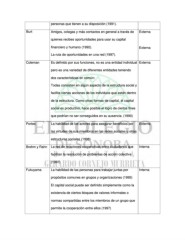 personas que tienen a su disposición (1991). Burt Amigos, colegas y más contactos en general a través de Externa quienes recibes oportunidades para usar su capital financiero y humano (1992). Externa La ruta de oportunidades en una red (1997). Coleman Es definido por sus funciones, no es una entidad individual Externa pero es una variedad de diferentes entidades teniendo dos características en común: Todas consisten en algún aspecto de la estructura social y facilita ciertas acciones de los individuos que están dentro de la estructura. Como otras formas de capital, el capital social es productivo, hace posible el logro de ciertos fines que podrían no ser conseguidos en su ausencia. (1990) Portes La habilidad de los actores para asegurar beneficios por Externa las virtudes de sus miembros en las redes sociales u otras estructuras sociales (1998) Brehm y Rahn La red de relaciones cooperativas entre ciudadanos que Interna facilitan la resolución de problemas de acción colectiva (1997) Fukuyama La habilidad de las personas para trabajar juntas por Interna propósitos comunes en grupos y organizaciones (1995) El capital social puede ser definido simplemente como la existencia de ciertos bloques de valores informales o normas compartidas entre los miembros de un grupo que permite la cooperación entre ellos (1997)